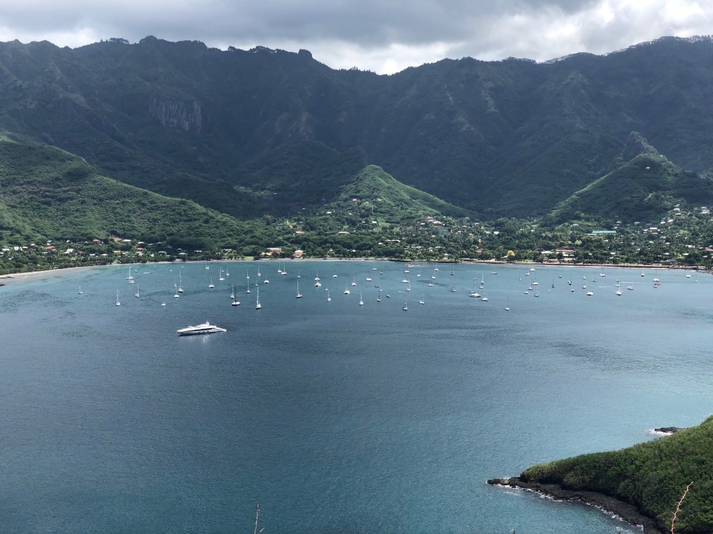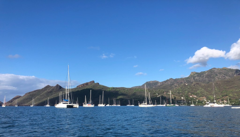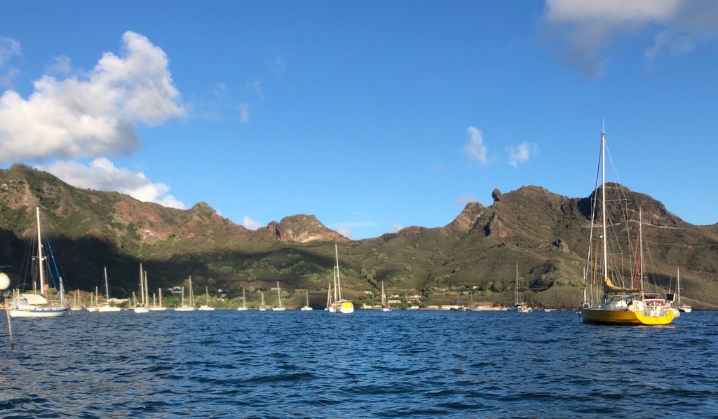 At this time, there must be 90- 100 sailboats anchored; however, boats are encouraged to move on during this quarantine to either Tahiti or Hawaii as soon as possible. Visible in the foreground also El Leon, an Italian-made boat of a nice Tuscany couple who is punctually served and escorted by 9 British crew. The boat won the 2019 award for Best interior design.