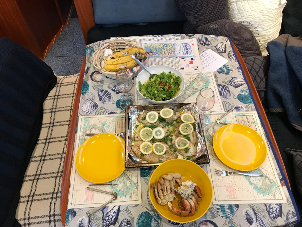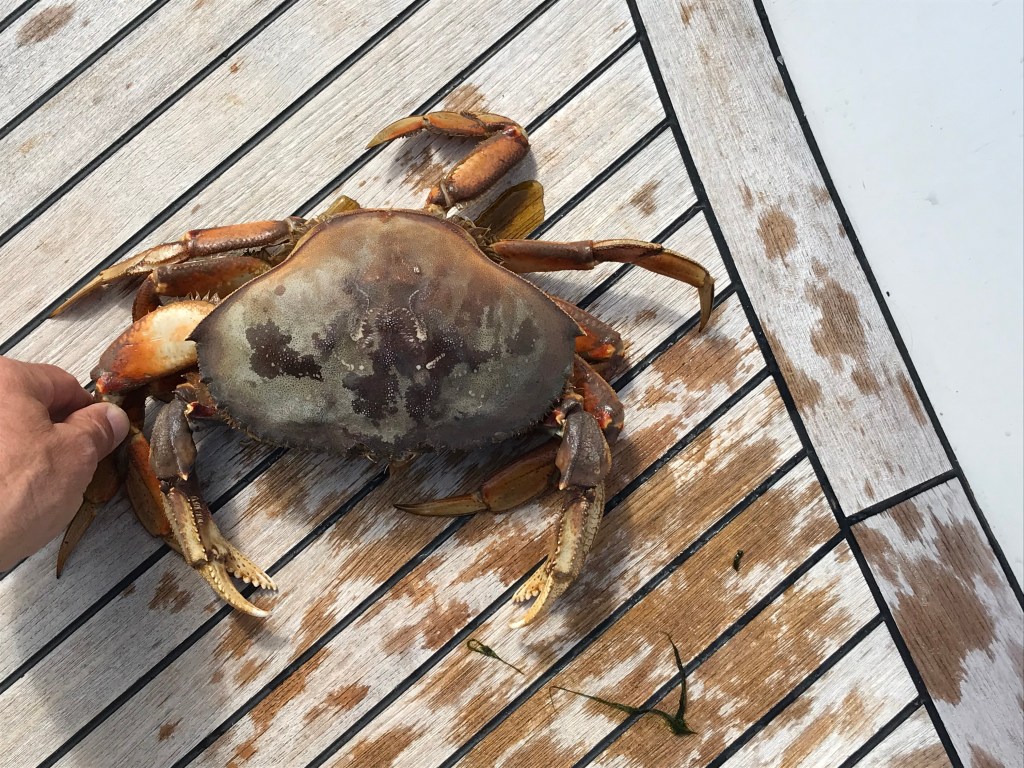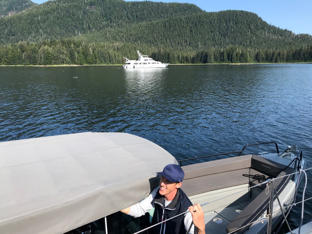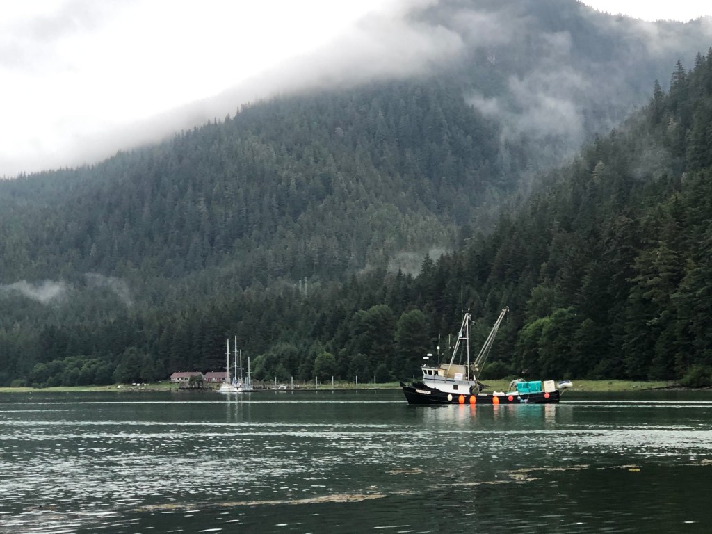 After leaving Juneau, we headed south via Stephen’s Passage to reach Taku Harbor. Waiting out a storm, surrounded by local crab pots, we had two days of relaxation. It was so nice to be anchored in a lovely harbor while the wind in Stephen’s Passage reached 40 knots! Giorgio finally had the opportunity to set his new crab pot which ended up tangled up in the rudder. We learned that we had to set the pots away from the boat!