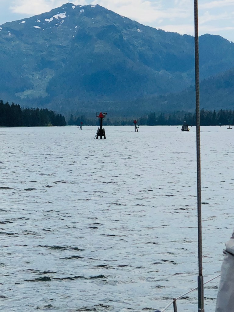 Wrangell Narrows lies between Mitkof Island on the east and Woesodski and Kupreanof Islands on the west. It is a 21 mile navigational challenge! Although the channel was well marked, we had to pay absolute attention to our course and stay away from shallow areas and rocks. The current was also particularly strong in many places. We did not have much traffic to contend with and the weather was fortunately good.