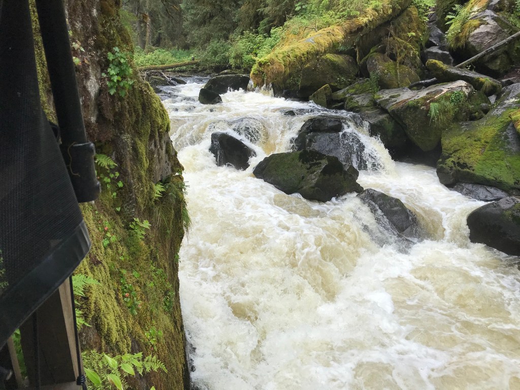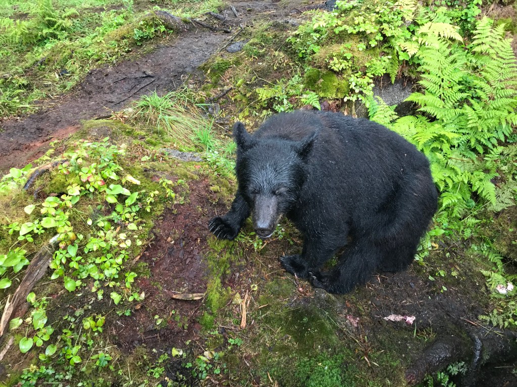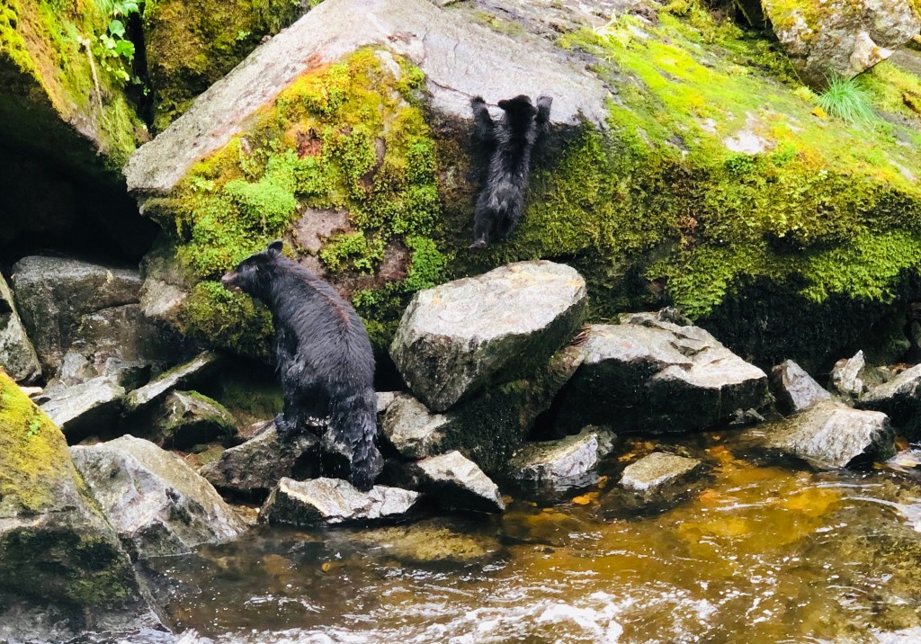 We had the wonderful opportunity to visit the Anan Bear Observatory in the Tongass National Forest. Anan Creek is home to one of the largest runs of pink salmon in SE Alaska which supports the large population of black and brown bears. We did not see any brown bears, apparently they stay further upriver. However, we watched around a dozen black bears catching salmon in the river. What a rare opportunity to see the bears up close in their natural environment feasting on their favorite food! They would reach into the water, make a few swipes with their giant paws and catch one salmon after another. They would have a few bites and leave the carcass on the rocks for the eagles and ravens to clean up and enjoy.