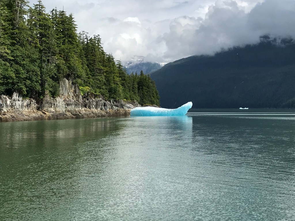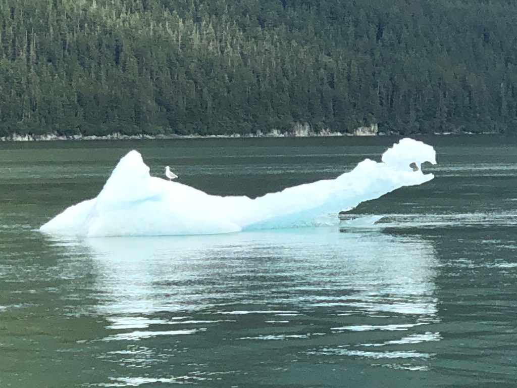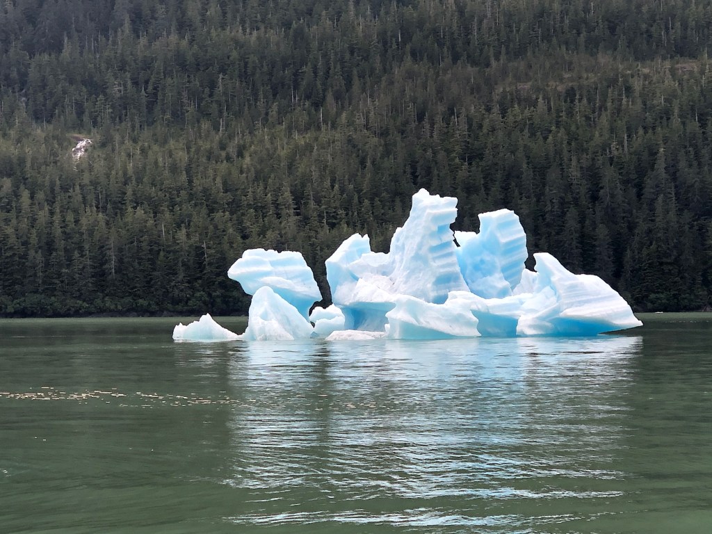 We continued south in Stephen’s Passage to reach Tracy’s Arm, a spectacular fjord about 45 miles south of Juneau. Sawyer Glacier, the bluest of glaciers, is located about 6 miles up the fjord at the end of Tracy’s Arm. We zig-zagged up the fjord surrounded by waterfalls, icebergs, growlers and Tiffany blue ice sculptures.