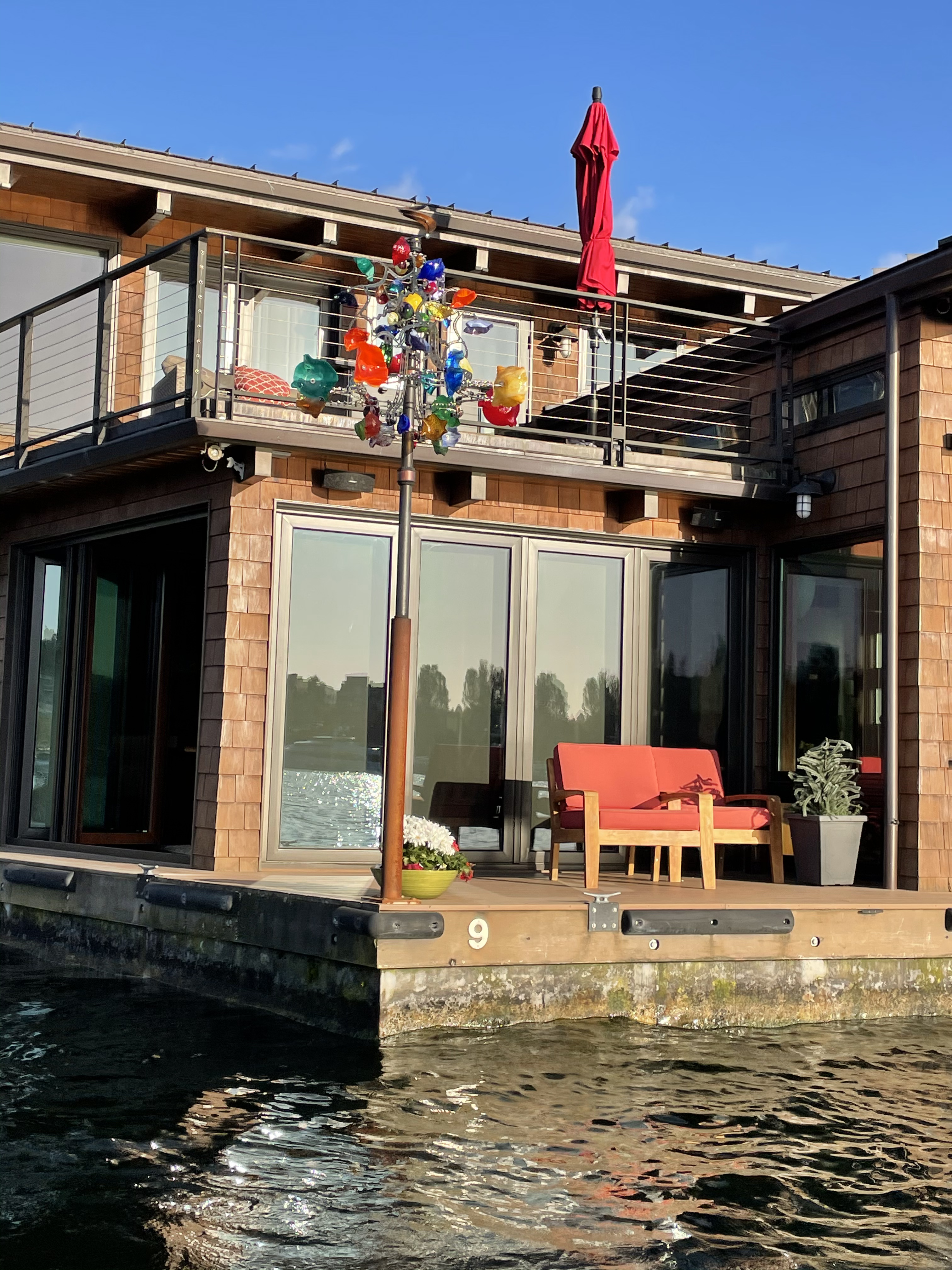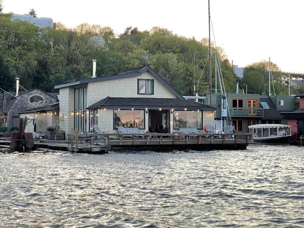 In Seattle’s Lake Union there are many boat houses. Some are old, some very new. Some are very picturesque. The one on the right has a colored “glass wind sculpture”. Each level turns around in different directions and the patterns are beautiful. We chatted with the owner, a biotech inventor. Many of these boat houses are valued at more than 4 million dollars! Most of the cost is related to the position, being in the front row or in the back: location, location, location.