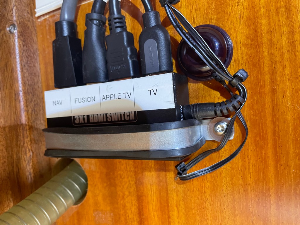 6. Bad HDMI Cord. We always had very a inconsistent signal from our Apple TV when plugged to the iPhone from the beginning. The only way we could watch our downloaded movies on the iPhone was to plug and unplug the iPhone to reset the signal- over and over again. I had a hard time believing that it could be that brand new HDMI cable installed by the factory! Once I began to entertain that idea, I decided to bite the bullet and we replaced the cable. This involved running a new cable from the Apple TV, under the saloon floor, to the portside chairs. When we tested the new cable, the signal was perfect and the problem was solved immediately. Now, I don’t need to stand up anymore!