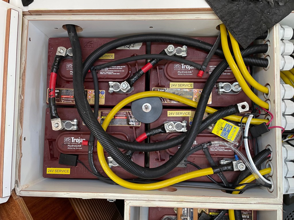 2. Battery Bank. During our five-month absence, Pete McGonagle, the U.S. West Coast Hallberg-Rassy Dealer, took care of the boat, faithfully checking the dehumidifiers and heaters once a week and starting the engine and the generator once a month. Unfortunately, Giorgio forgot to tell him to add distilled water to our acid-lead batteries and he didn’t investigate what type of batteries we had.