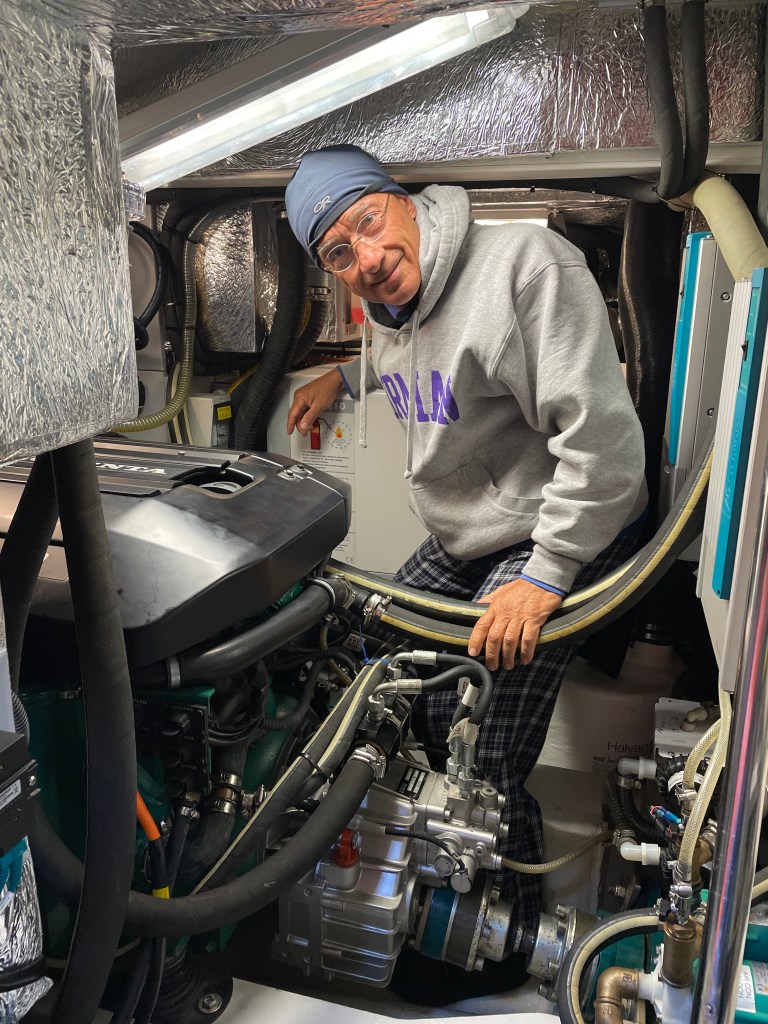- Who can do the job? Our main problem, wherever we go, is finding competent people to work on the boat. For example, Giorgio had been in contact with the main Volvo Repair Center in Seattle, since October 2020, about changing the main belts and the timing belt on our D3-110 Volvo Penta main engine, which are due at 1,400 hours. Here is a photo of the person who arrived, after having had five months to prepare for this job, as he reads his instruction manual. After 30 minutes of reading, fussing and fuming, Giorgio sent him on his way. We will have to find someone in Canada (if it opens) or in San Francisco to do the job.