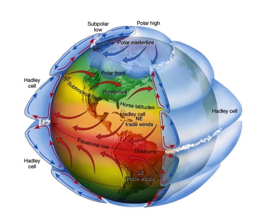 This uplifting creates an area of low pressure that triggers the movement of adjacent air masses, hundreds of miles wide, from both sides of the equator. This movement of air, north and south of the doldrums, forms the trade winds: from the northeast in the northern hemisphere and from the southeast in the southern hemisphere. If seen tridimensionally, the Hadley cells represent these atmospheric circulation patterns.