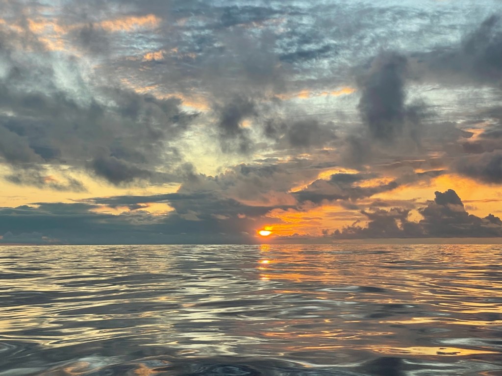 Calm sea, clouds, and lack of wind in the Doldrums.