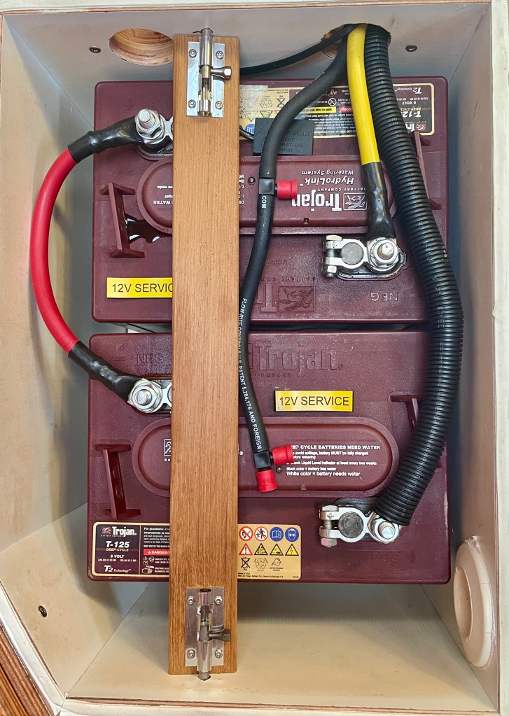 Our house bank is 24v but the instruments are powered by two 6v batteries in series = 12v which overheated due to overcharging with the engine constantly running. Fortunately, Kevin had knowledge of this problem and the batteries were disconnected in time.