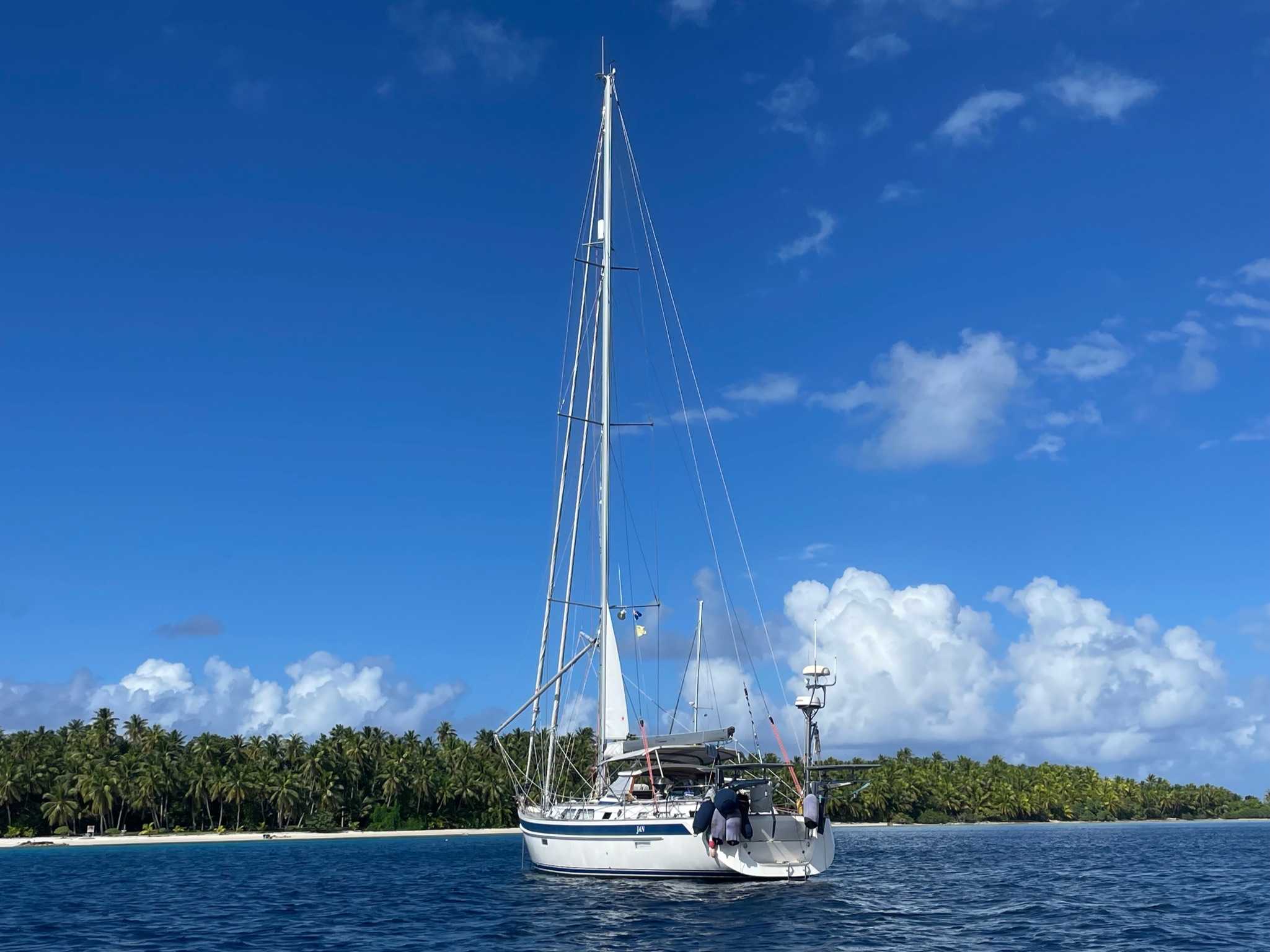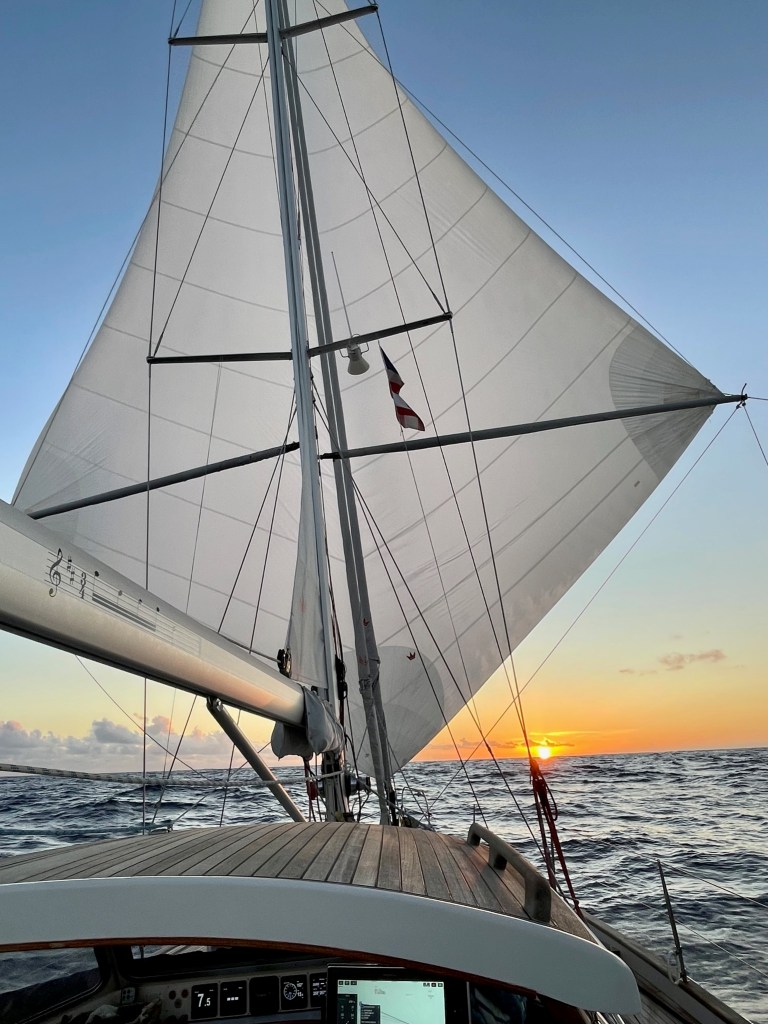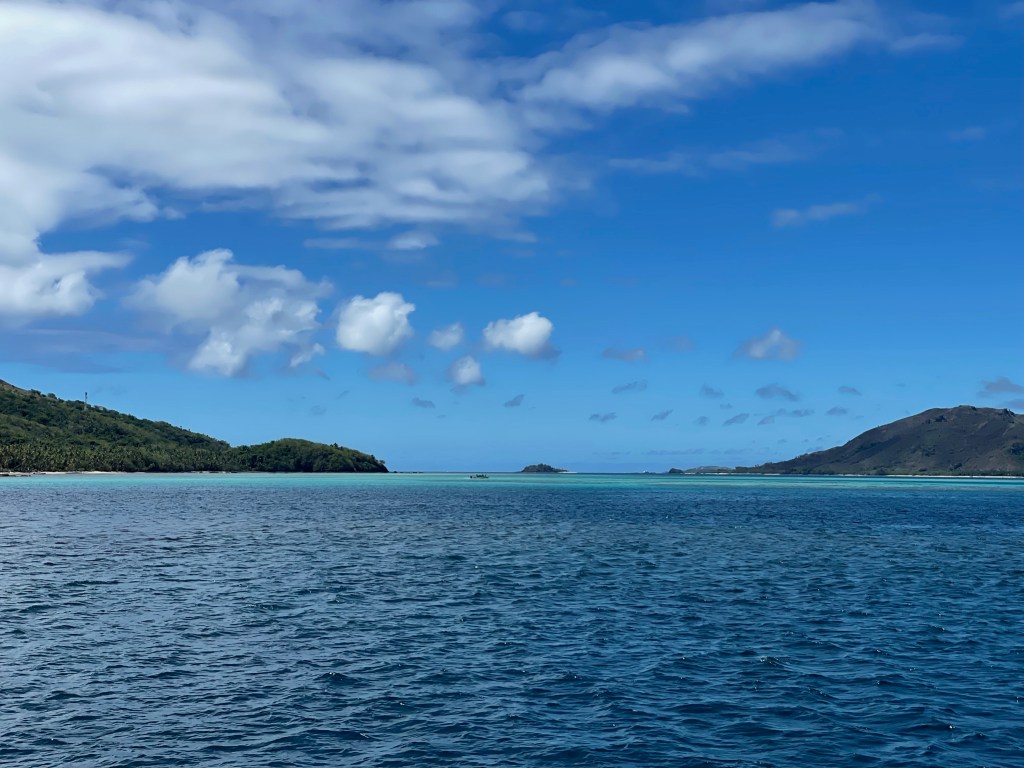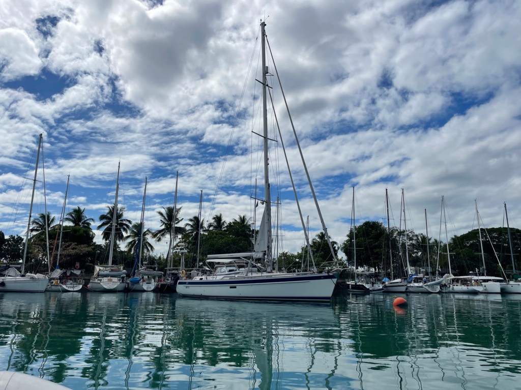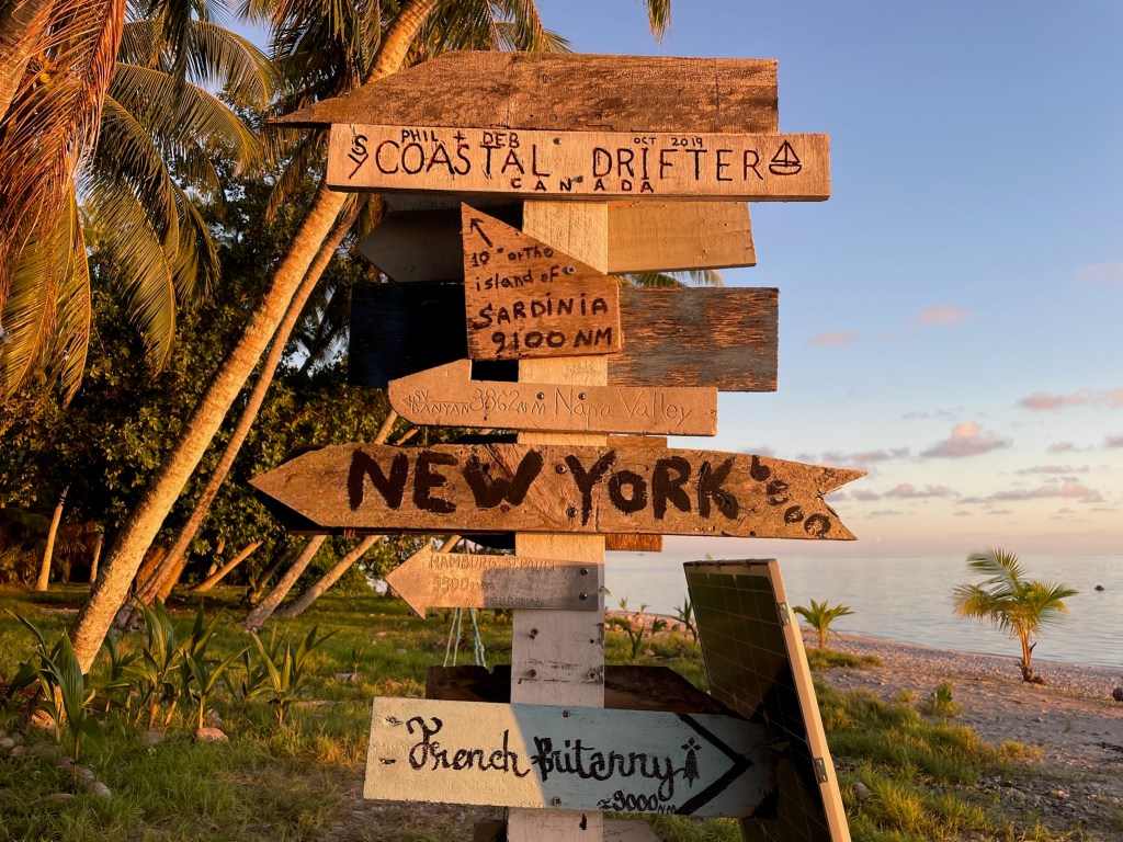 We returned to the boat in Tahiti on July 4, 2023, after attending our older son Robbie’s wedding in Rome, Italy. Next, our goal was to reach Fiji by mid-August, so we could fly back to Italy to attend our younger son Marco’s wedding. After clearing Customs in Bora Bora and following the advice of a professional weather router, we headed northwest to Suwarrow and American Samoa, then southwest to Fiji. Our original plan was to go to Tonga to swim with the whales, but the winds were blowing hard and against us at that time.