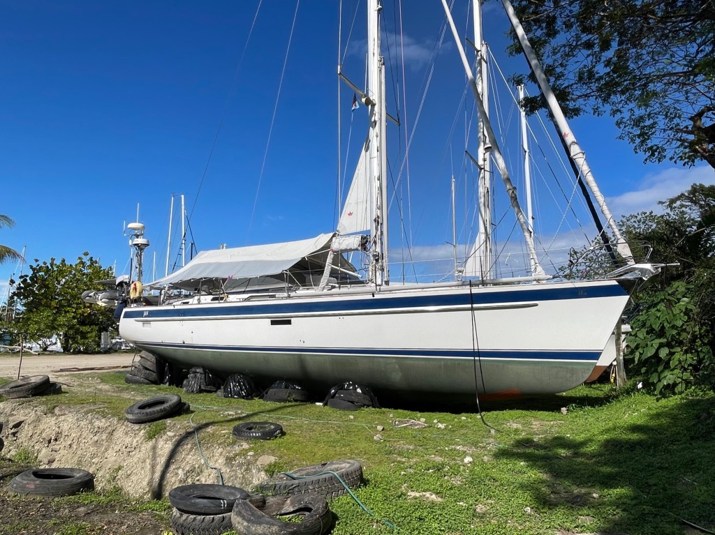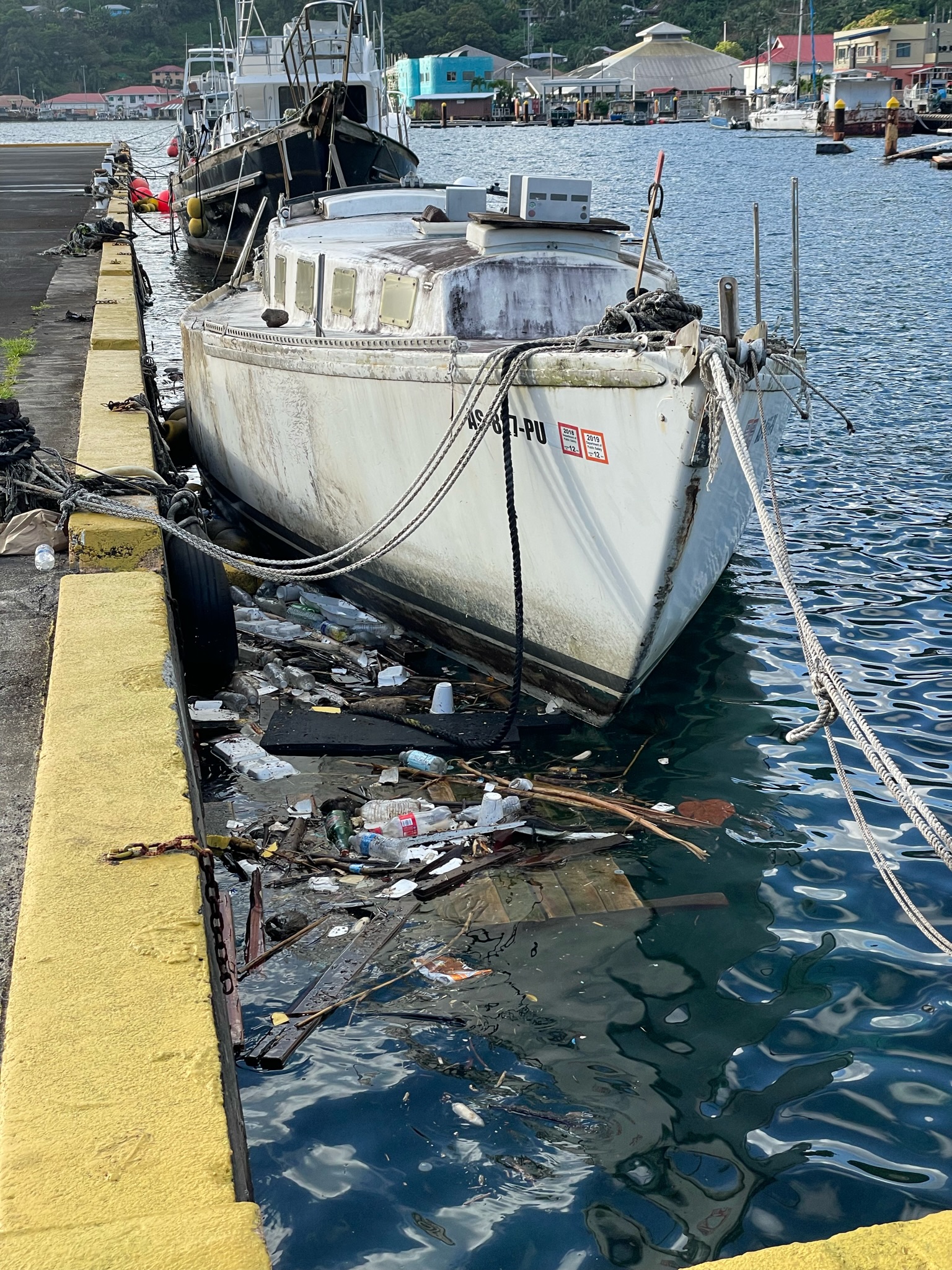 SV JAN on a buoy in Vuda Marina, Fiji.
