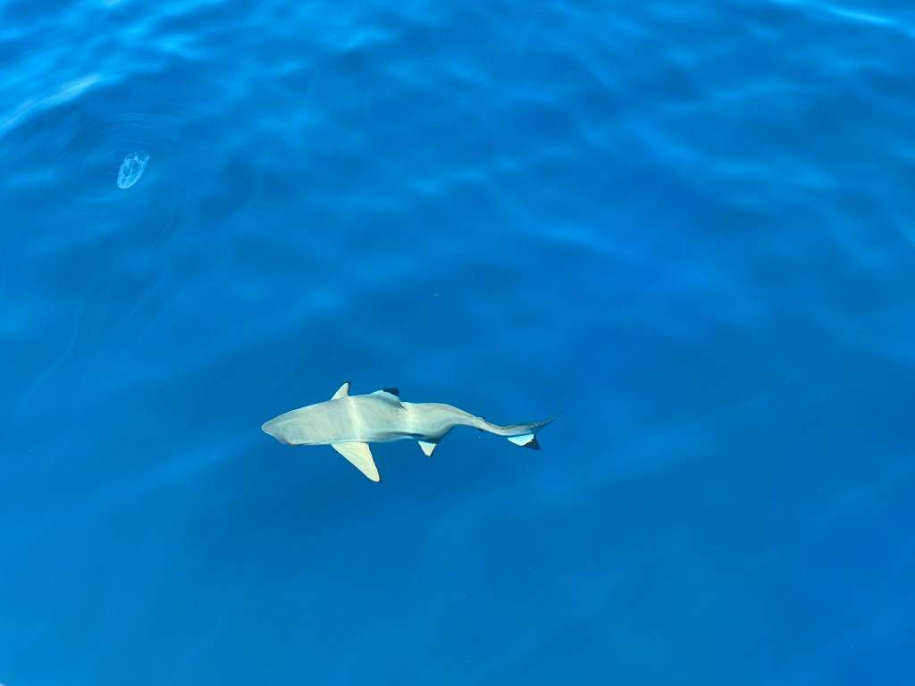 Several black-tipped sharks were swimming around our boat. Notice the large jellyfish in the upper left corner. They didn’t deter us from swimming.