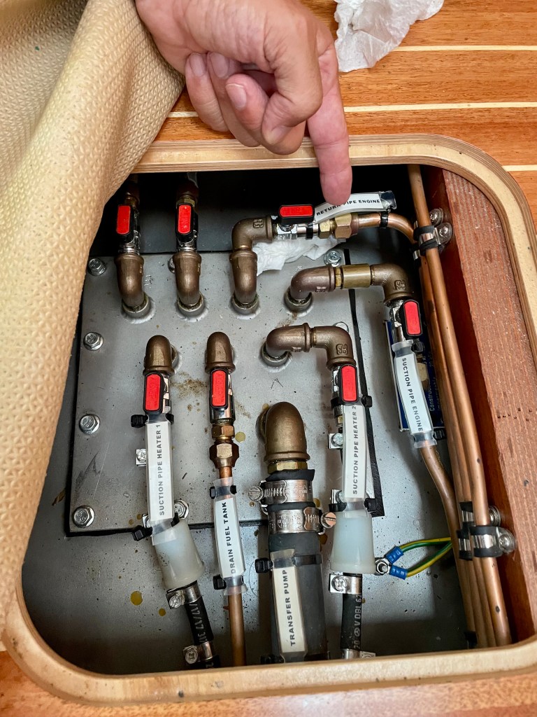 For several days we smelled diesel fuel in the saloon and we had found some fuel in the deep bilge. We have two fuel tanks for a total of more than 220 gallons. Giorgio was able to find the leak in the main tank and repair it.