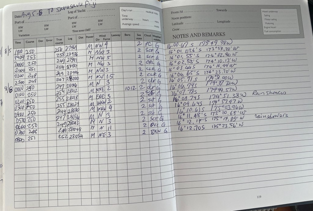 We keep hourly reports of the conditions during navigation in a logbook. Here you can see the lack of wind and our progress/position, etc.