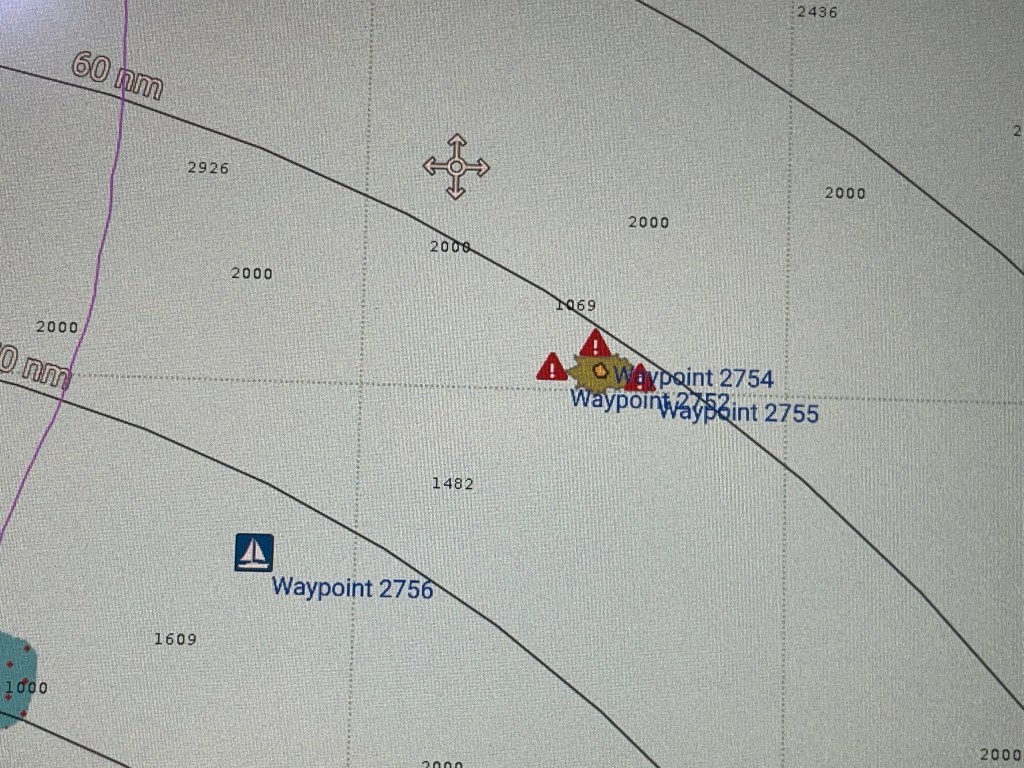 South of the little island-rock, we crossed path with a large catamaran that passed behind us since we were pointing higher. Note that, at this magnification, the rock is marked only by our red-alert marks.