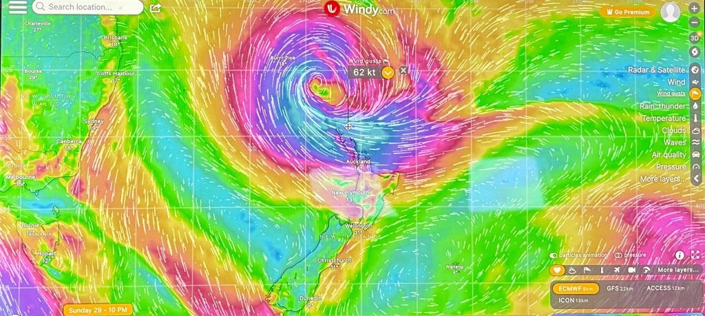 It is also important to time the passage with the next low-pressure system arriving north of New Zealand because that will determine the strength of the westerlies. In between the easterlies and the westerlies, there is often a windless area called, in the past, “horse latitudes” because, before the invention of mechanical propulsion, sailing ships used to be stuck there for days waiting for a reasonable breeze. When the fresh water supply started to become scarce, they threw the horses overboard.