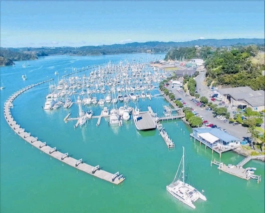 The glorious New Zealand flag— showing the four stars of the Southern Cross. Below: Our first stop for Customs: The Bay of Islands Marina in Opua.