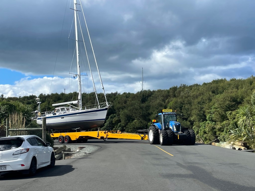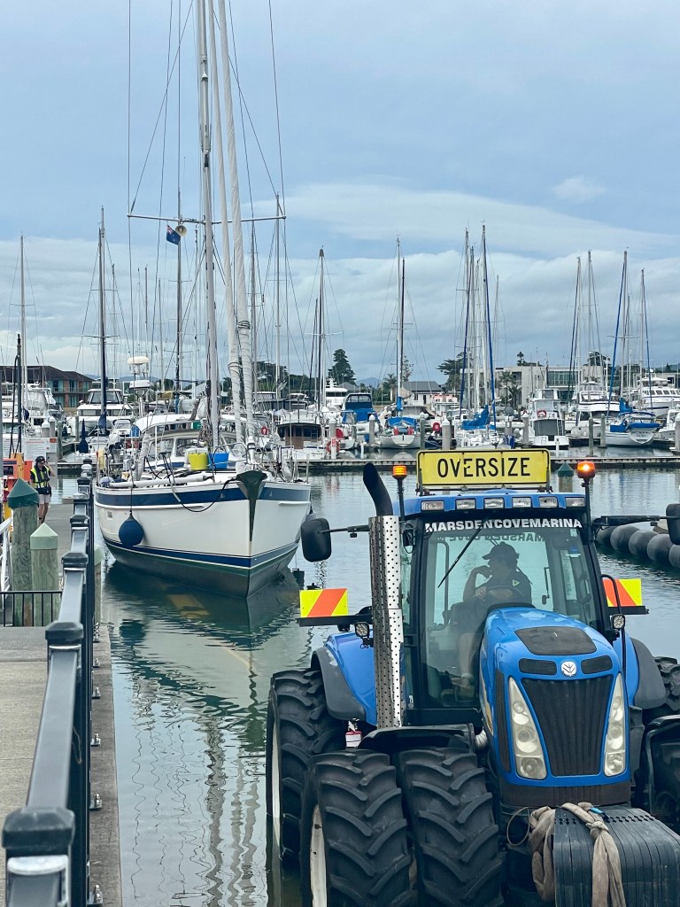 Located 70nm north of Auckland in the Whāngerei Harbor, Marsden Cove is our favorite marina in New Zealand for hauling out. It is a modern marina with top-notch facilities and a well-managed dry dock. The efficiency of the haul-out crew and equipment was far superior to what we had experienced in our travels across the Atlantic and the Pacific. They don’t use the Travelift system but the a new Roodberg hydraulic slipway trailer. What can usually be very stressful was an excellent experience for us.