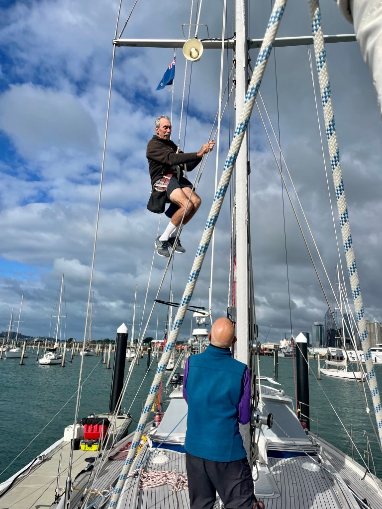 Steve is over 60 but climbs the mast using his arms and legs, using a halyard as a safety line: Giorgio pulled the slack off the halyard as Steve hoisted himself up.