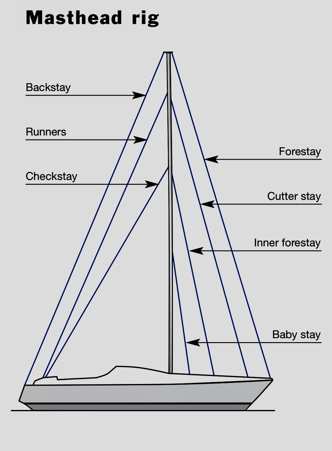 Our mast is quite complex, having three orders of spreaders and a total of 17 wires of different diameters, from eight to 14 mm. From the bow to the stern, they include the forestay, the cutter stay, the cap shrouds V1-V3, D4 X2, the intermediate shrouds D2, D3 X2, the lower shrouds D1F-D1A X2, and finally the backstay.