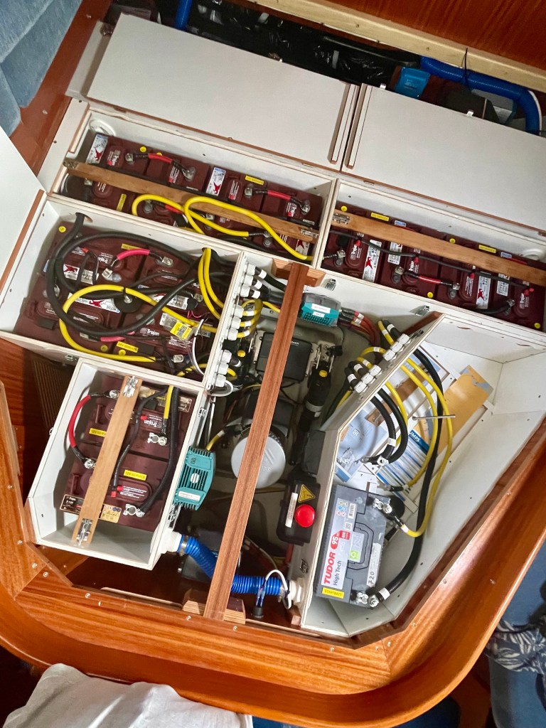 The unsealed Trojan batteries proved to be a poor choice since they require continuous maintenance. You must check the water levels in each battery at least once a month and replace the distilled water that evaporated during charging. Since they were located under our bed, every time we checked them, we had to remove the bedding and mattresses. The first set of 14 batteries lasted only three years, and the second set less than that. In addition, contrary to what Hallberg-Rassy told us, finding these batteries in French Polynesia and other Pacific Islands was impossible for us.
