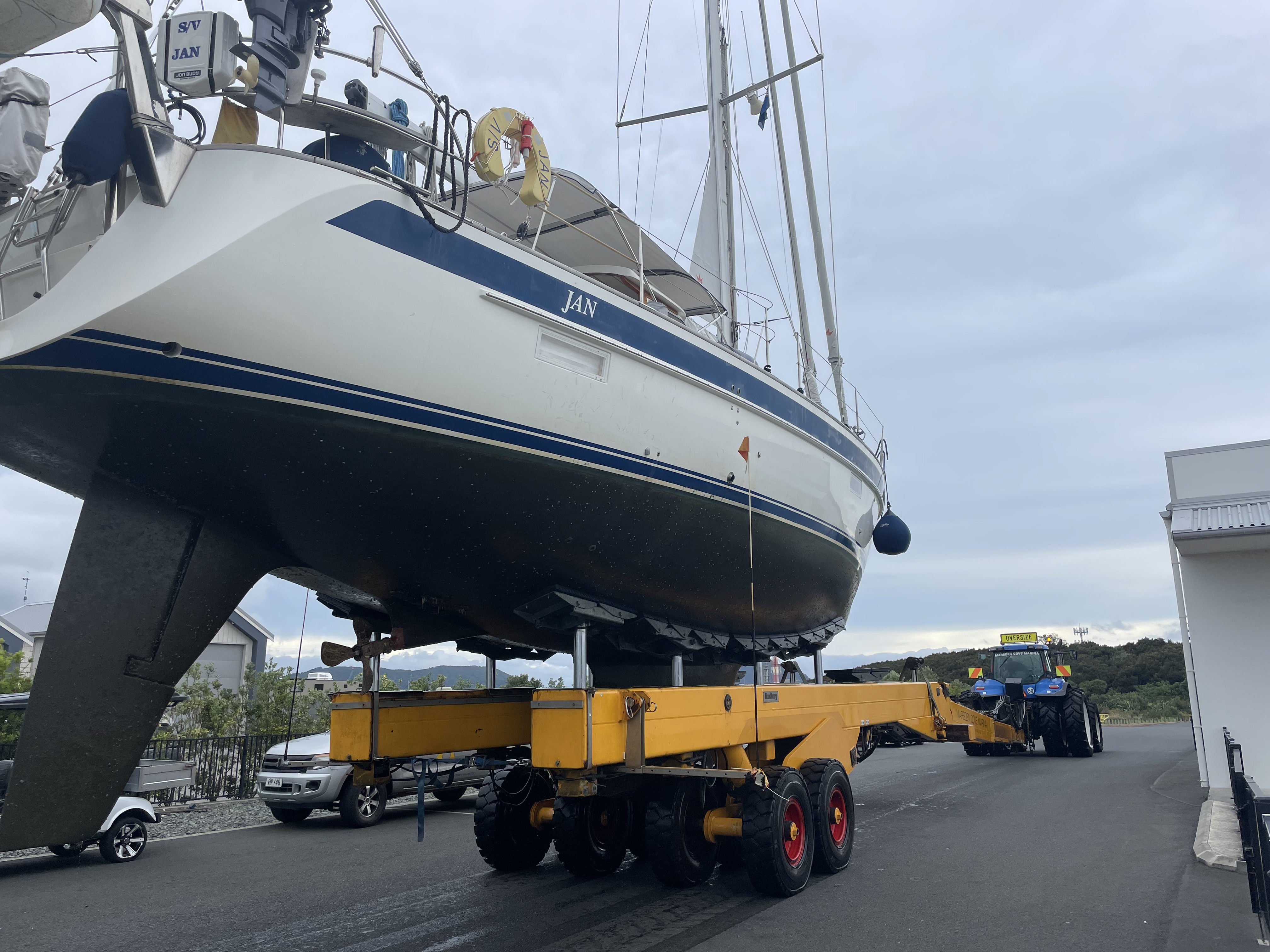Located 70nm north of Auckland in the Whāngerei Harbor, Marsden Cove is our favorite marina in New Zealand for hauling out. It is a modern marina with top-notch facilities and a well-managed dry dock. The efficiency of the haul-out crew and equipment was far superior to what we had experienced in our travels across the Atlantic and the Pacific. They don’t use the Travelift system but the a new Roodberg hydraulic slipway trailer. What can usually be very stressful was an excellent experience for us.