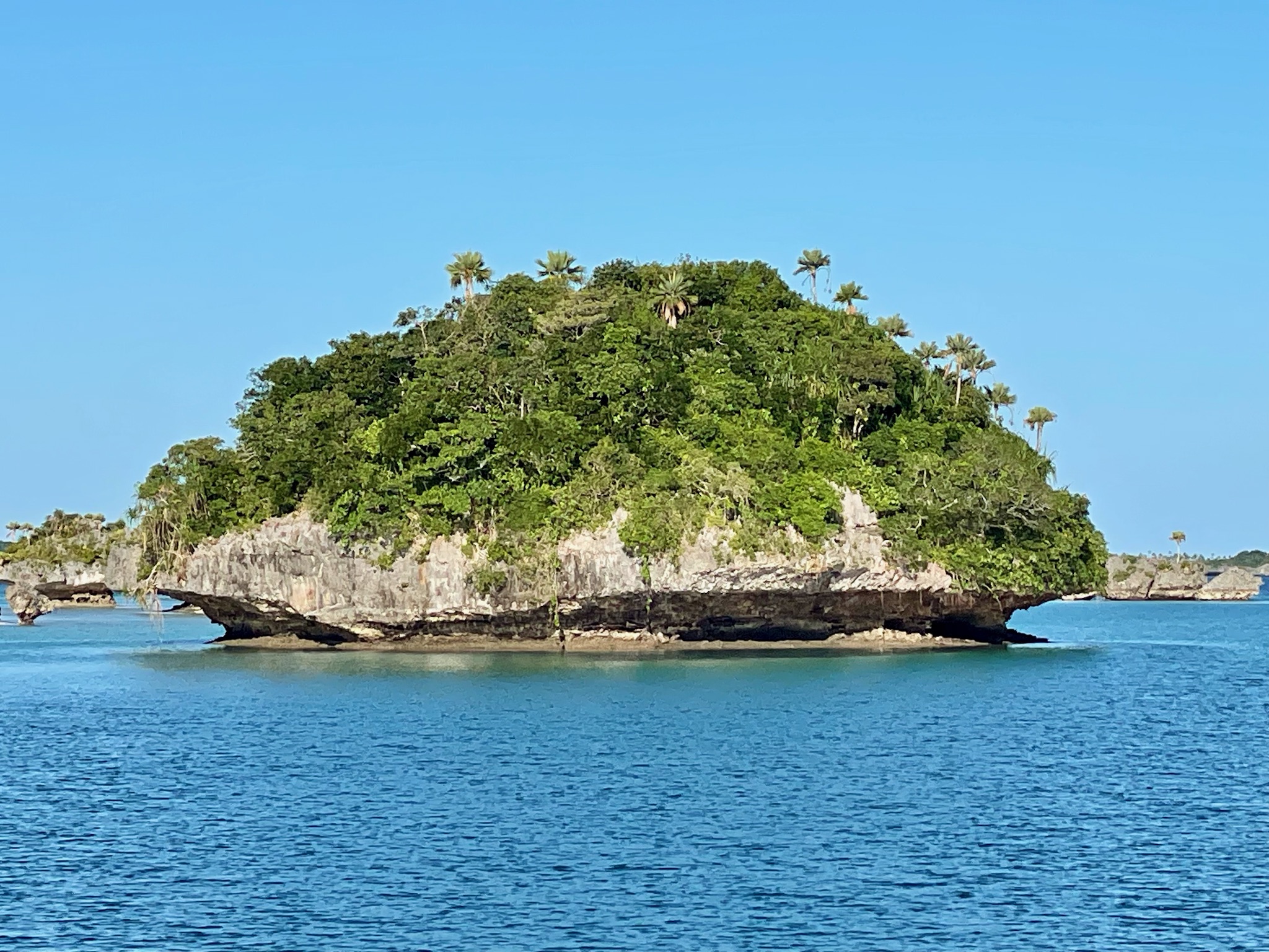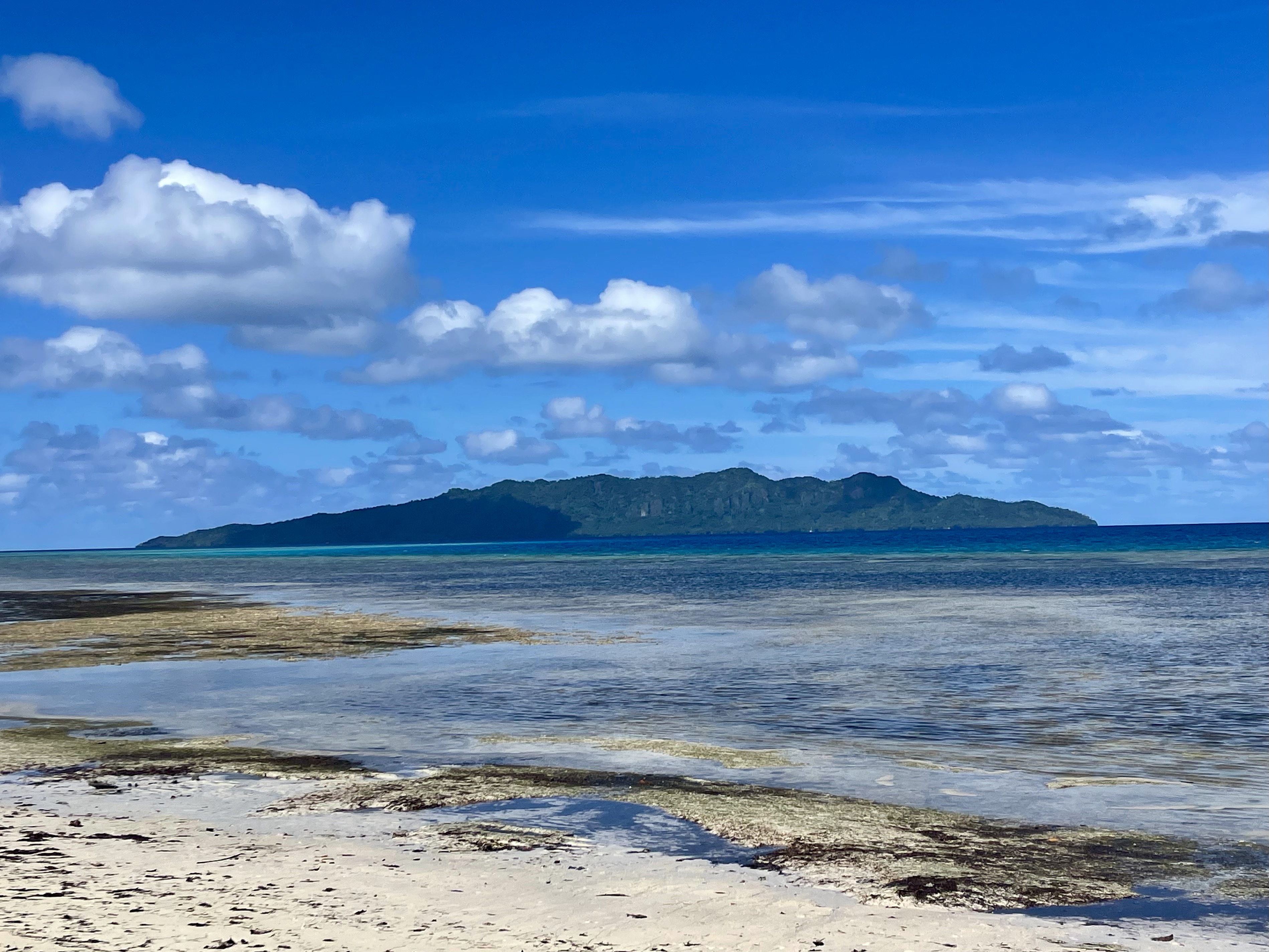 This is a large lagoon with only three tiny islands. One of them, a rugged, wild, craggy rock which was full of birds, has the only patch of sand, so this is where we anchored. We snorkeled around the rock, admiring the colorful fish, coral heads, and countless giant purple clams. At high tide, the waves jumping over the reef made the anchorage quite rolly. We were the only boat!