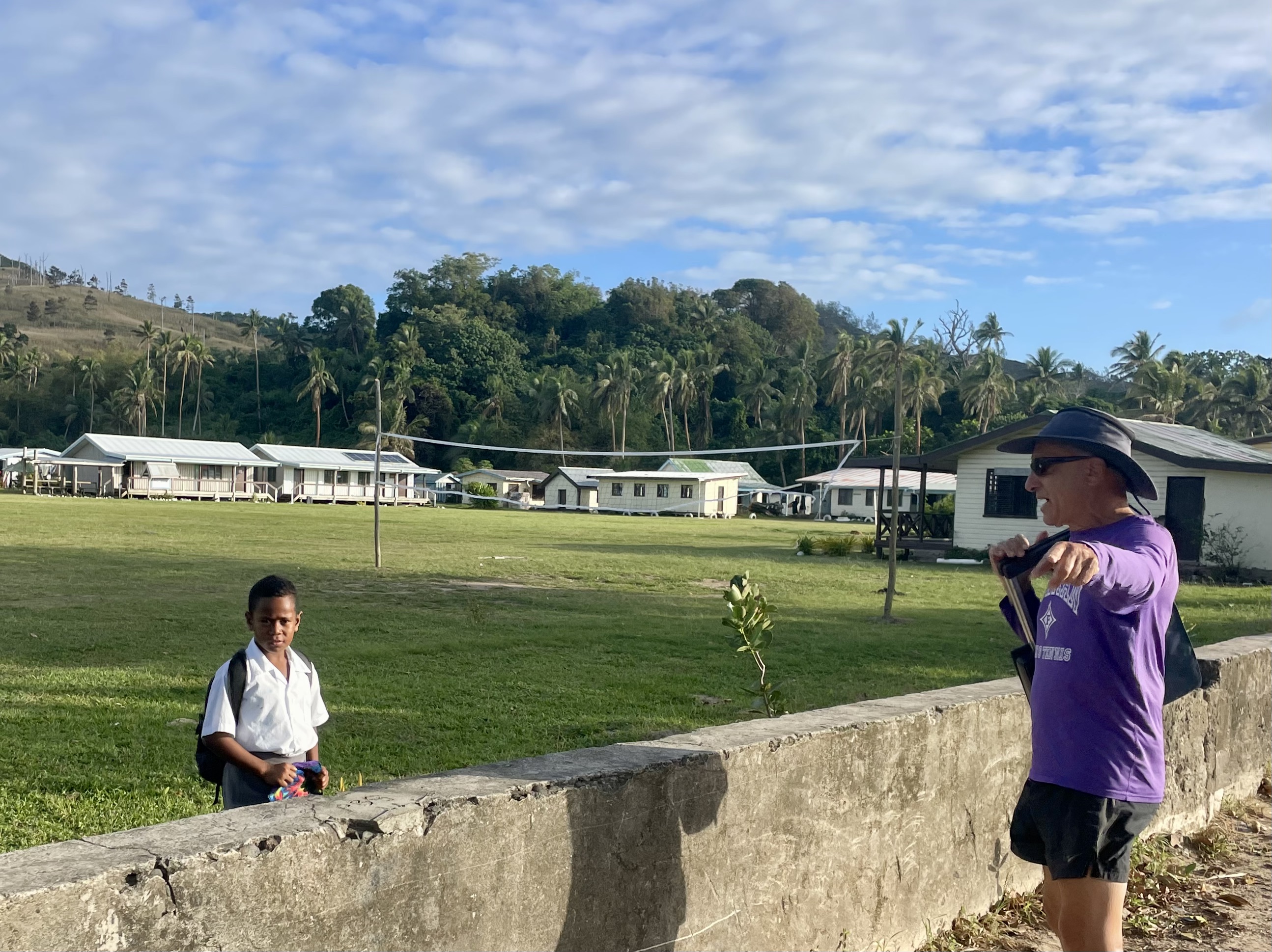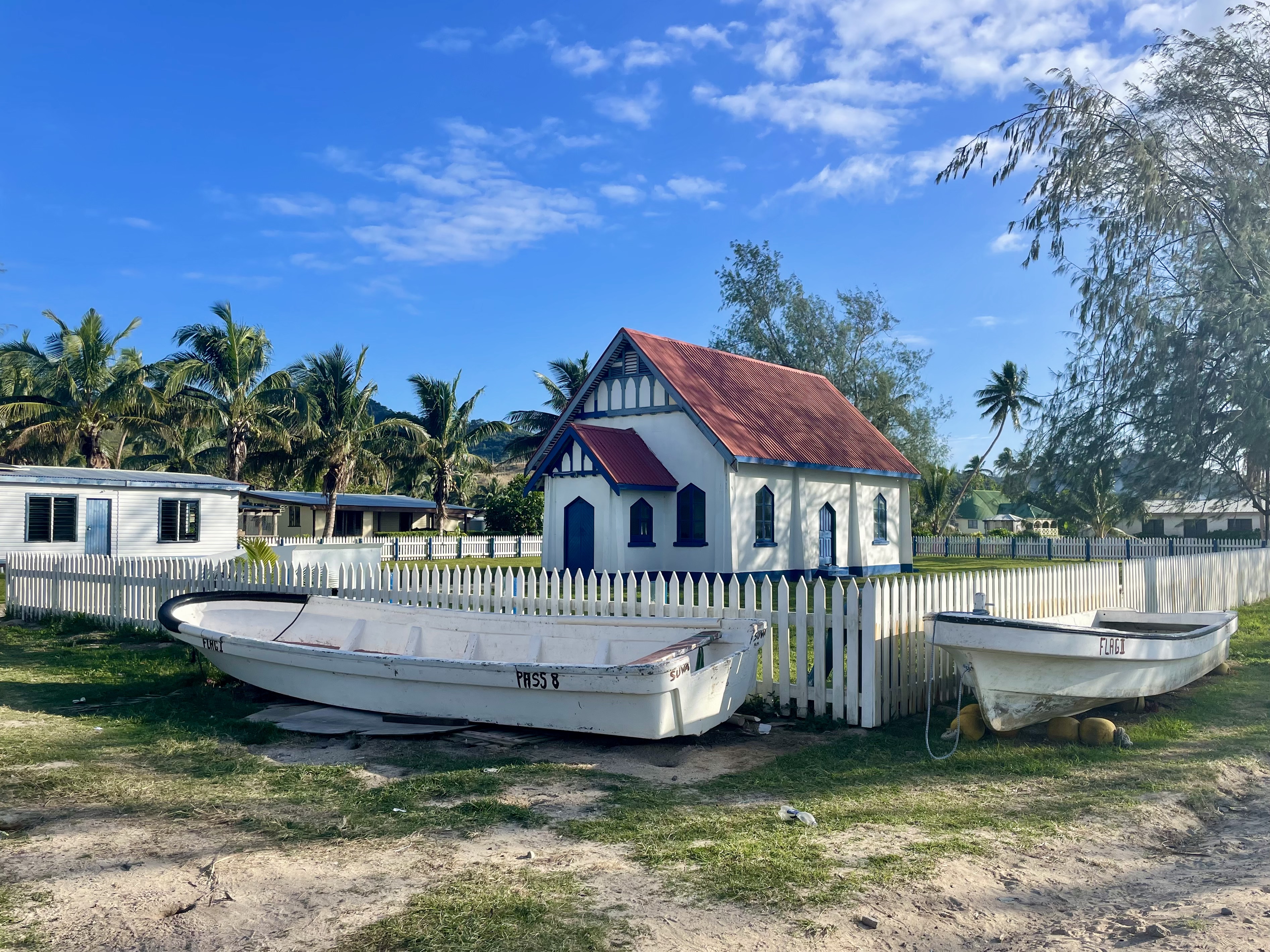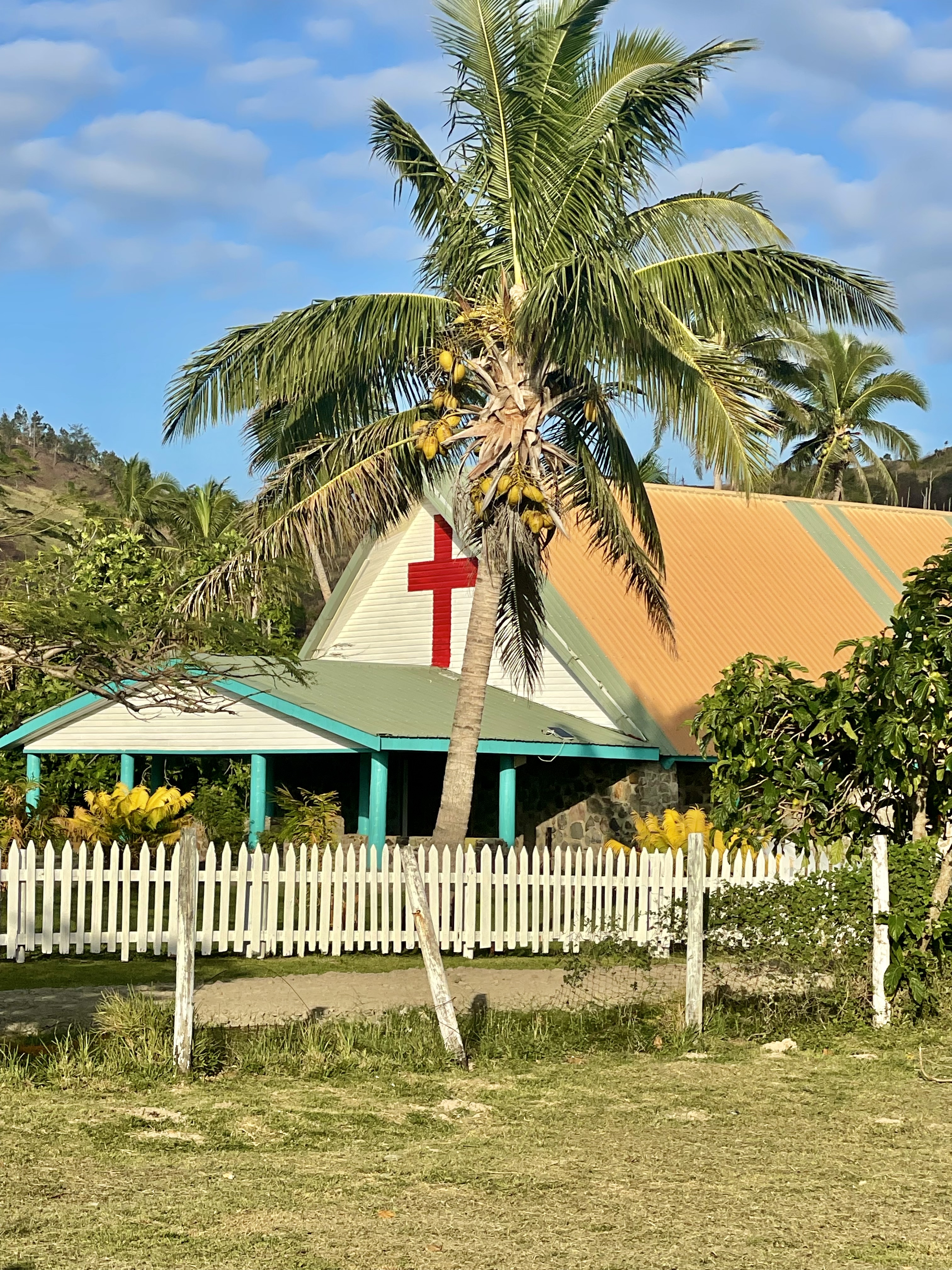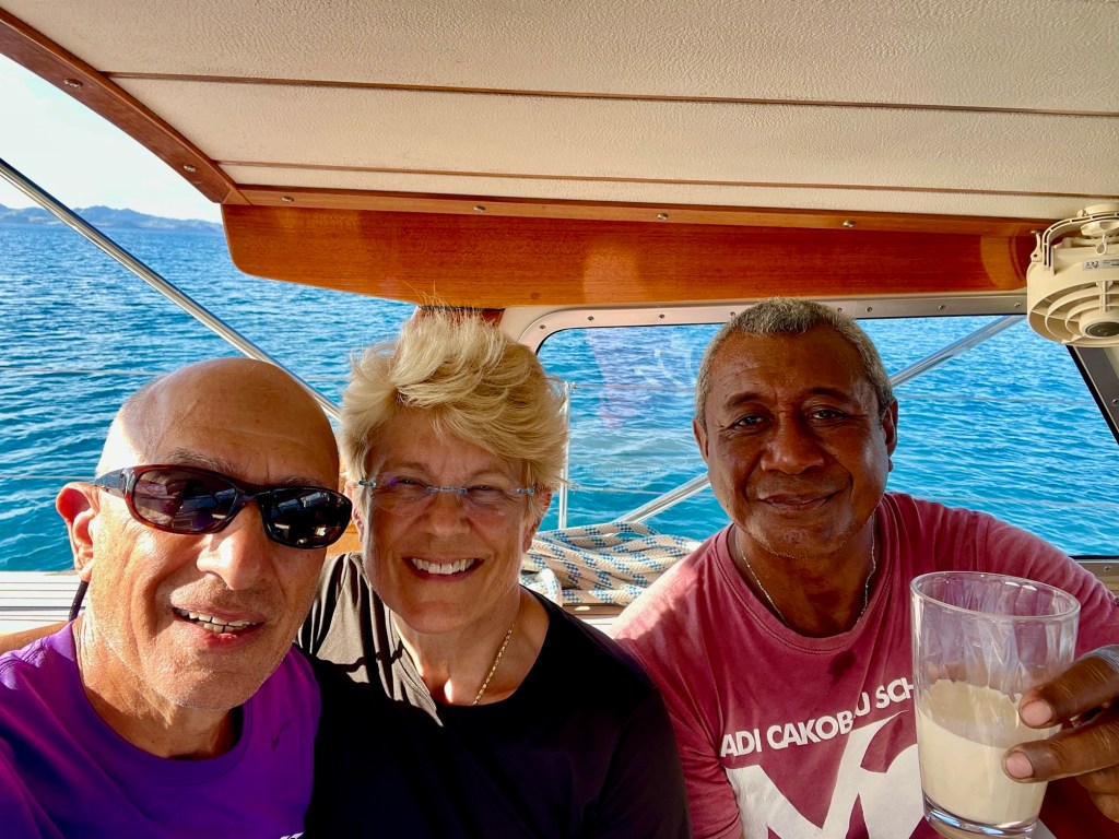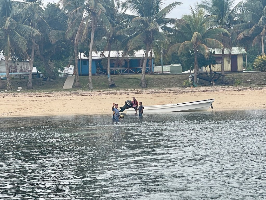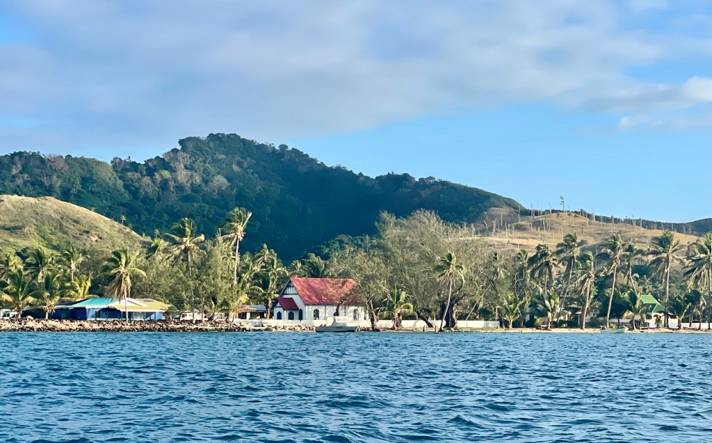 This is a small village of about 80 inhabitants, with a primary school and a church under reconstruction. The older children go across the bay to Lomaloma for secondary school. In February 2025, Tropical Cyclone Rae destroyed the church, along with several houses and many crops. After meeting Chief Felipe and doing Sevusevu, we were shown around the village and lagoon by Jacob, the headman. Later that day, we invited him to our boat for a cup of tea and cookies.