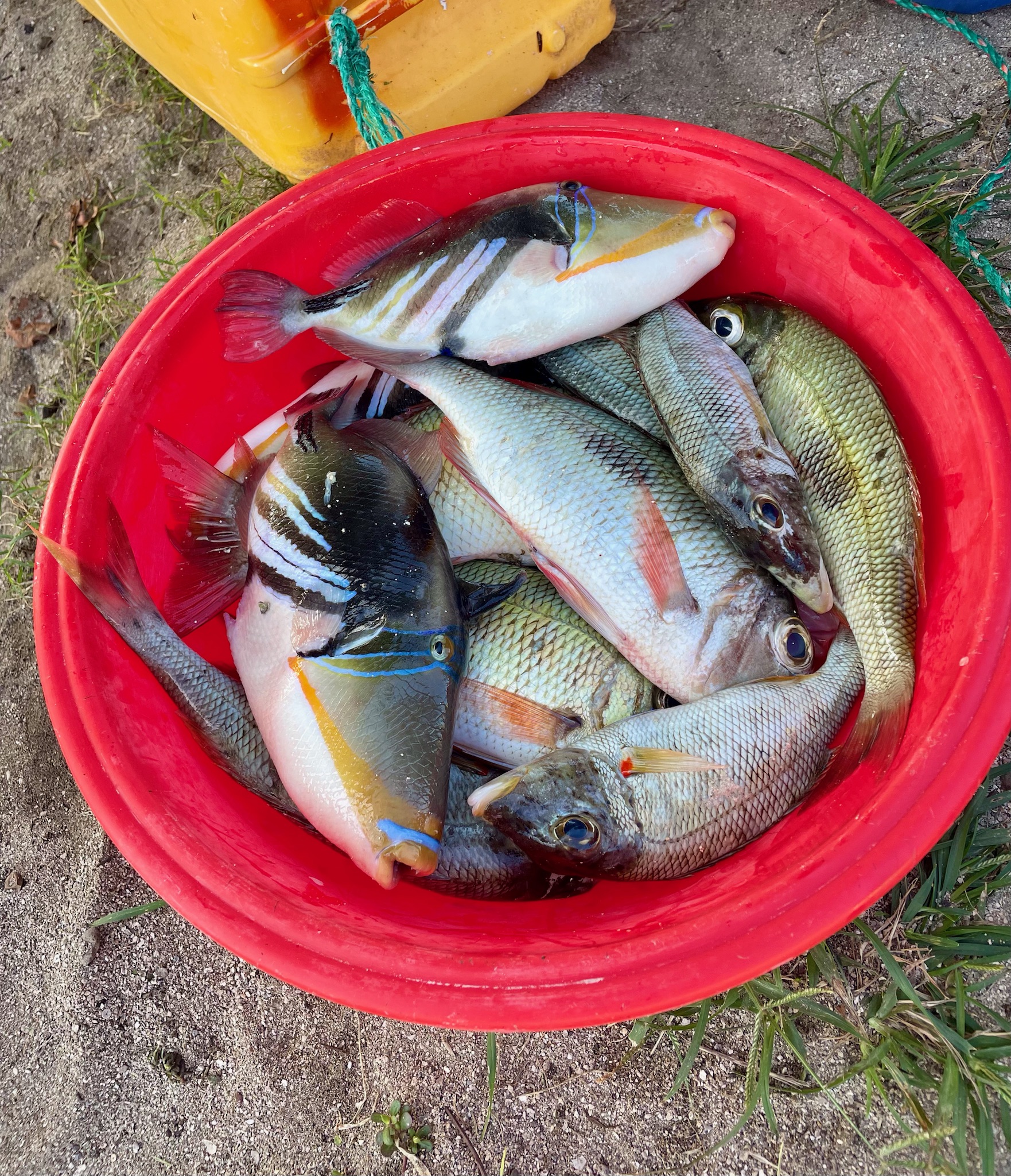 We walked for a couple of hours while Jacob looked for his wife, who had left in the morning to fish on the reef. We found her back in the village— her catch is shown in the bucket of colorful fish above.