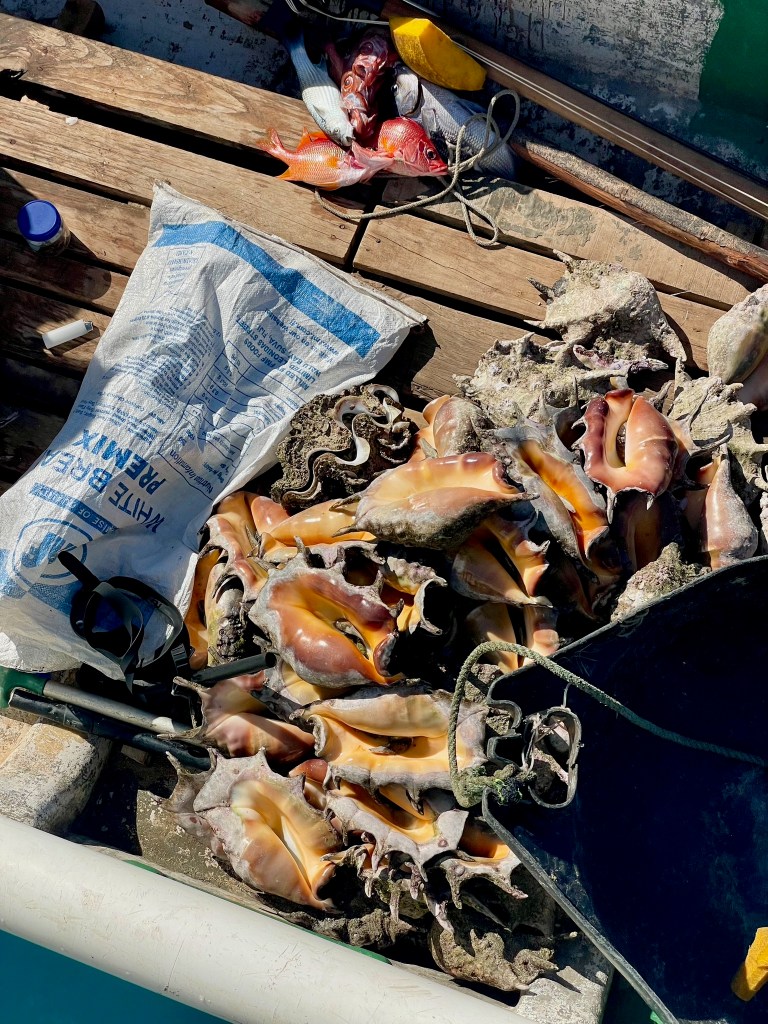 Their catch: a few fish and giant clams, and many conch shells with the mollusk inside.