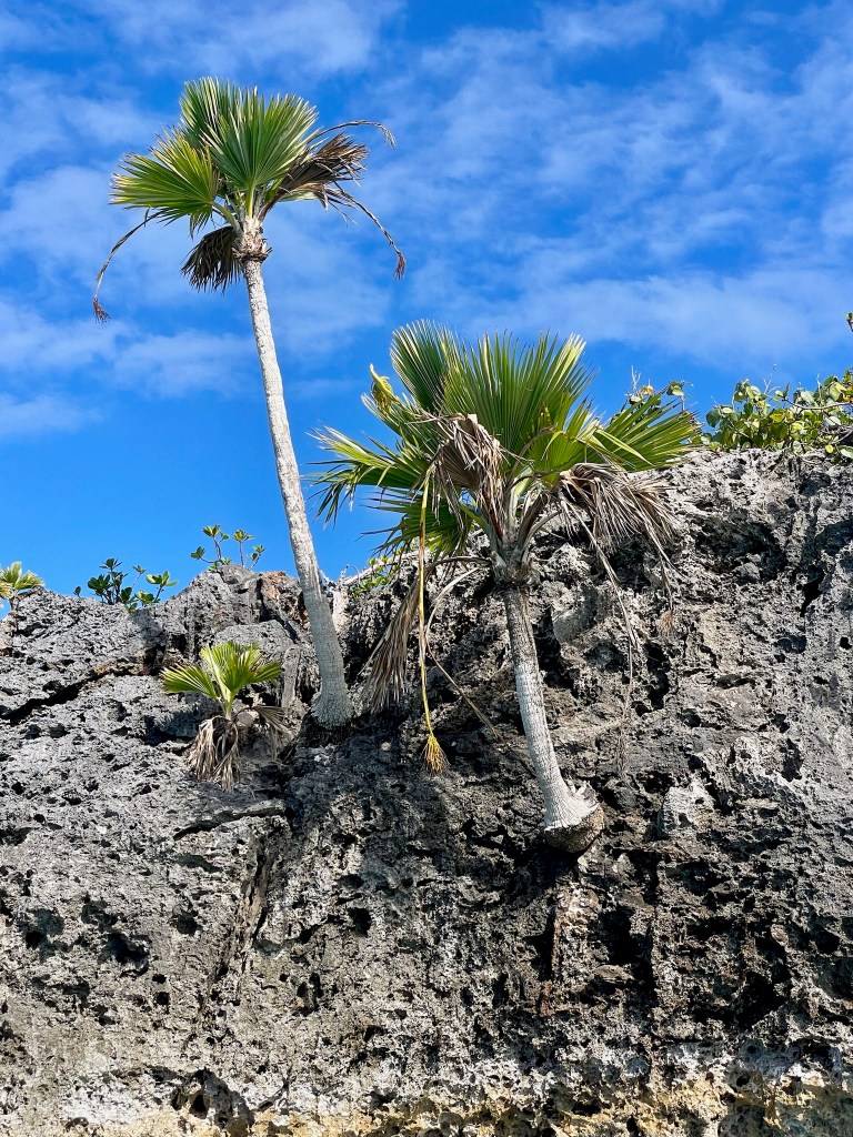 Two palm trees growing on the bare rock.
