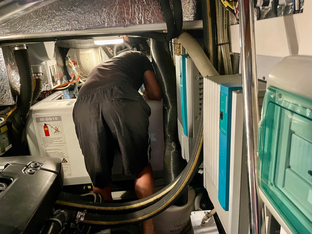 After much thought about why the generator was not working (and after reading the “Troubleshooting” section in the Owner’s Manual), Giorgio decided that it might have an airlock in the raw-water cooling system. We had been in big rolly seas on our overnight passage from Fulaga, and maybe that had caused the airlock. Fortunately, the fix was fairly simple. The most difficult and time-consuming task was removing part of the outer shell to expose the generator. Once that was done, Giorgio partially unscrewed the impeller cover and released the airlock. Problem solved! We were so relieved!